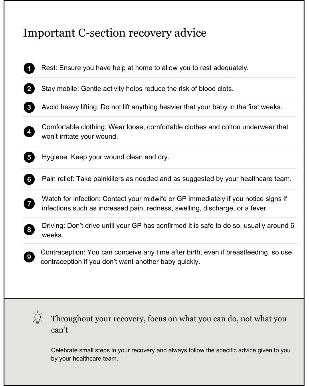 Remember that every person’s recovery is different. If you have any concerns or feel your recovery is not progressing as expected, you should always seek advice from your midwife or GP.