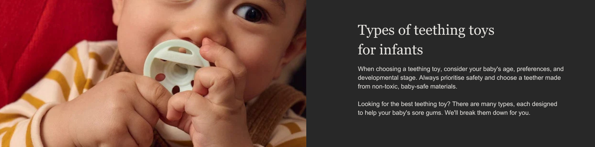 When picking out teething toys for your baby, their safety should be your top concern. Pick one that’s suitable for their age, and look closely at the materials, the toy’s design, and how easy it is to keep clean.