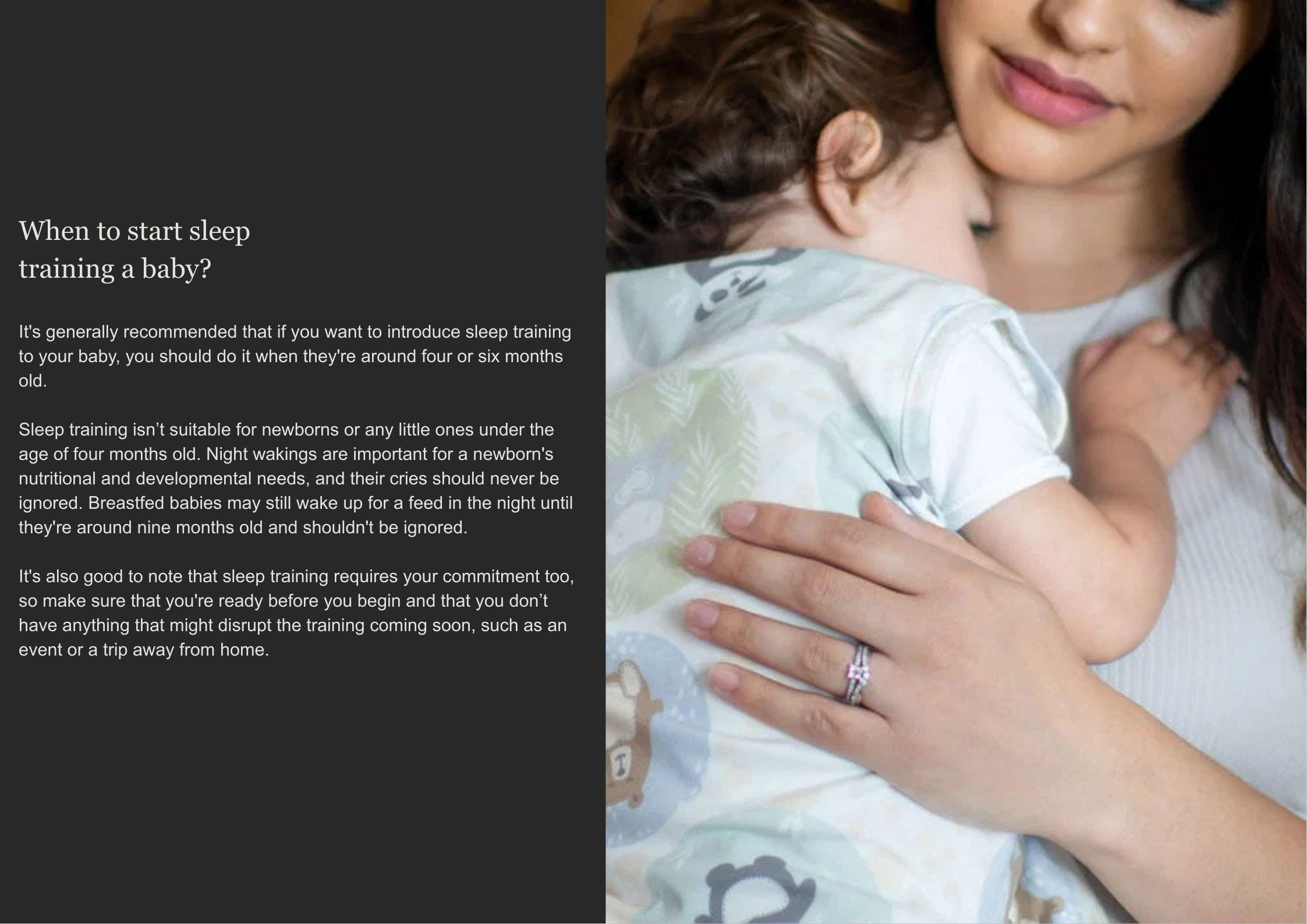 • Time it right: We’ve covered that some things can interrupt your baby’s sleep like them feeling unwell or your family taking a trip away, so it’s a good idea to wait until things have settled down before attempting sleep training.