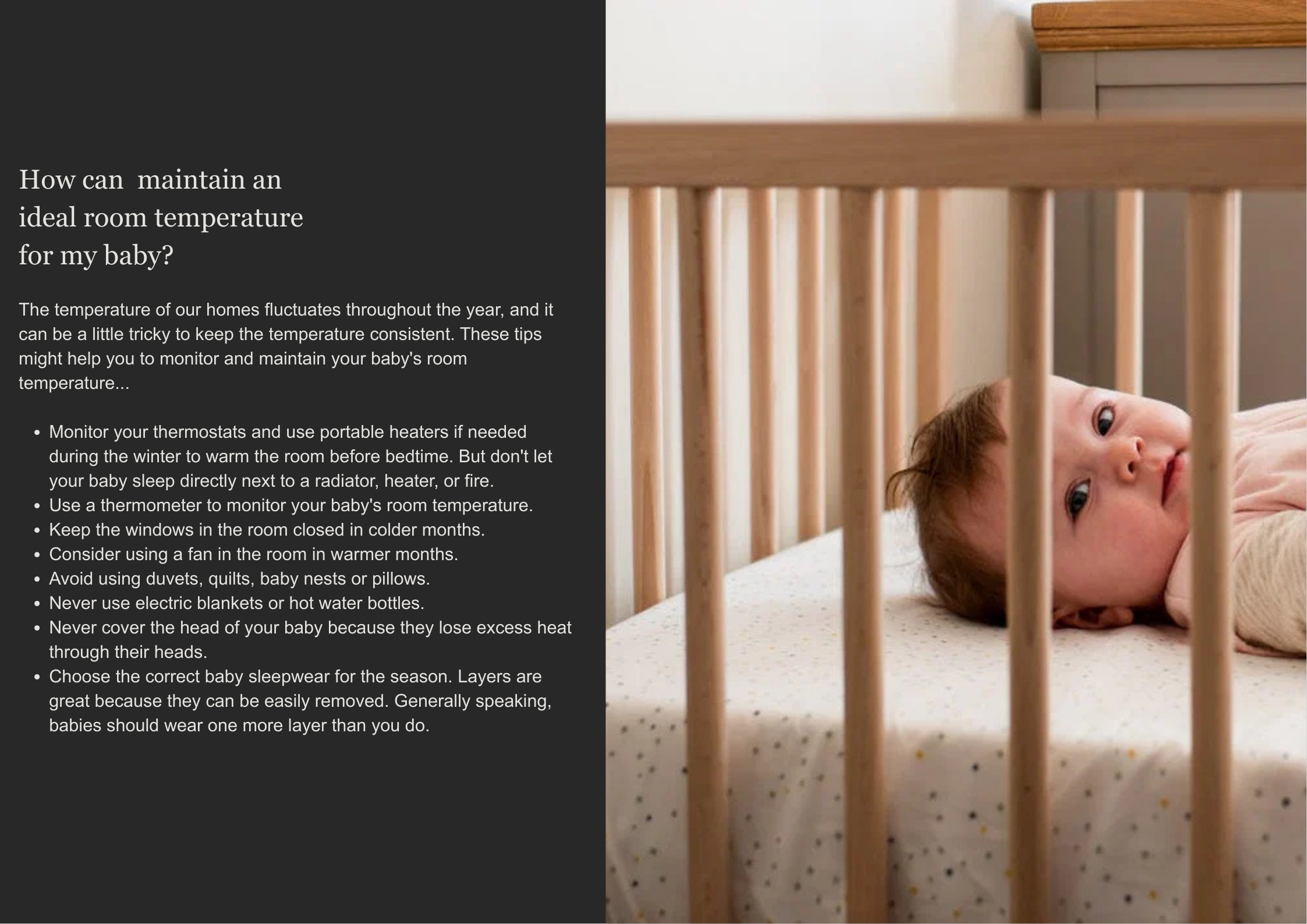 Making sure that your baby’s sleep space is at just the right temperature and not too hot or cold is very important.