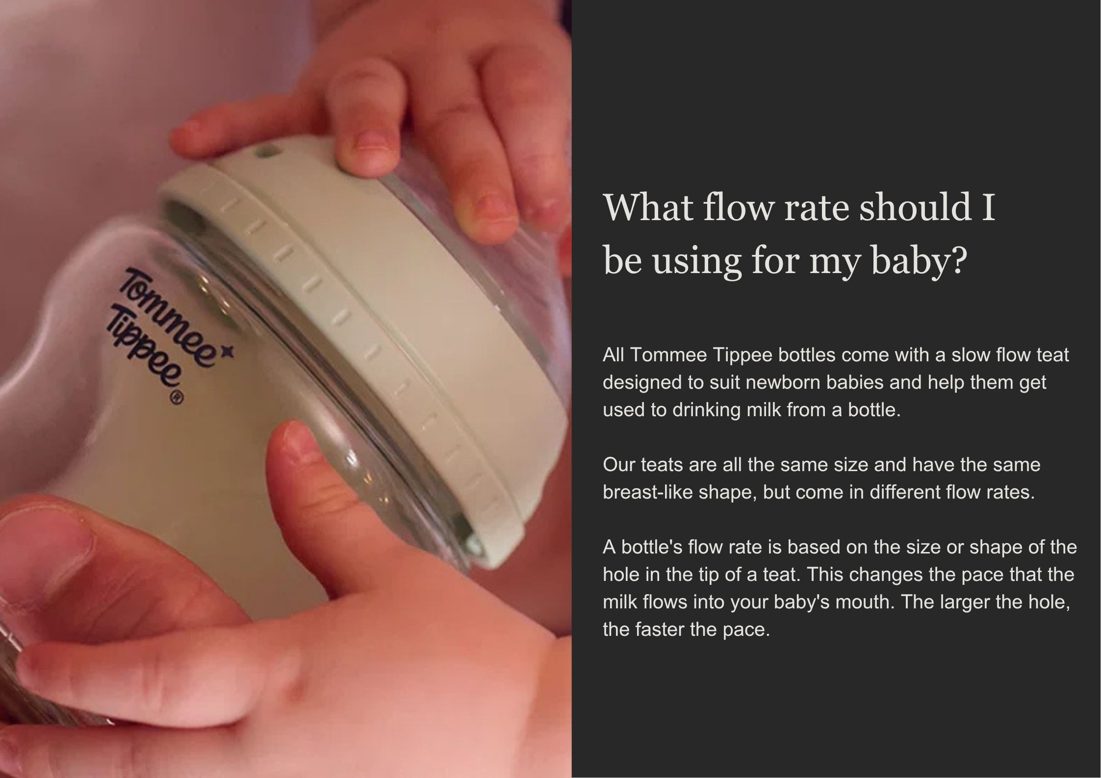 Our nipple like teats for bottles come in different flow rates to keep up with your growing baby (and their growing appetite). Each Tommee Tippee bottle teat is marked with a letter or number according to its flow rate. Please note that these ages are only a guide as every feeding journey is different.