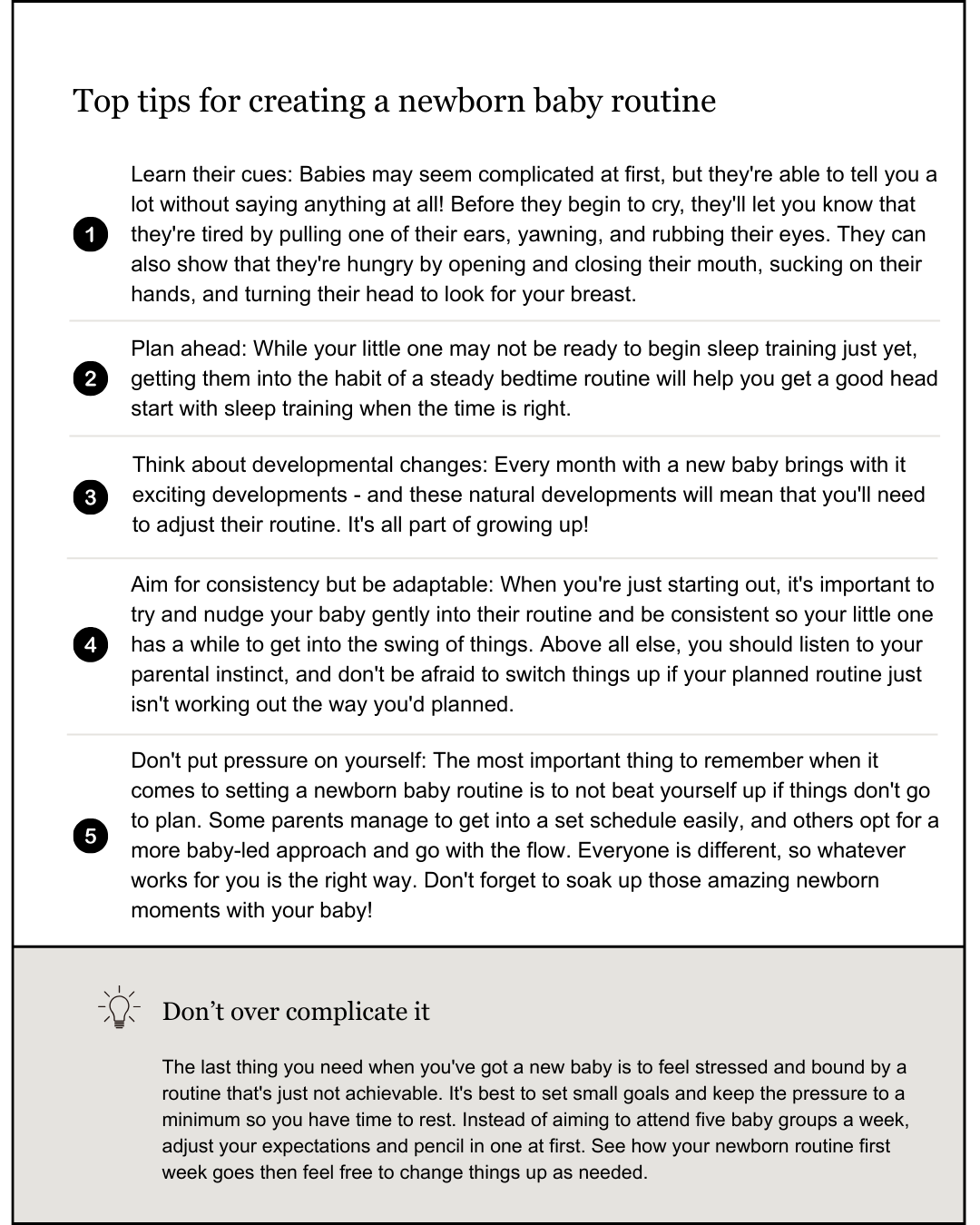 Every baby is different, but the key elements of a good newborn routine include times for sleeping, feeding, nappy changing, playing, and getting out and about.