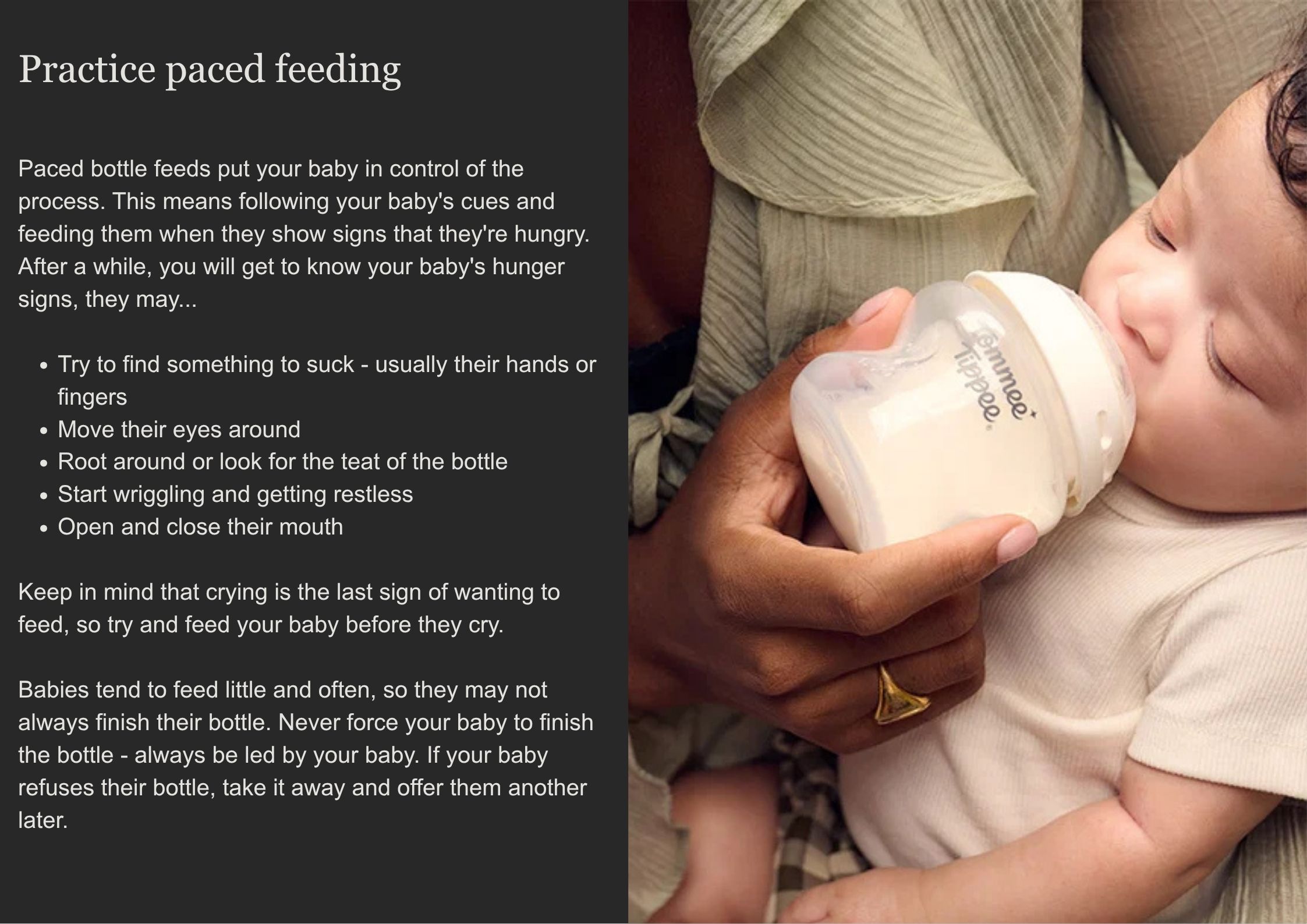 - When switching to a bottle or your baby is refusing a bottle, introduce a bottle slowly and at a calm time without any rush.