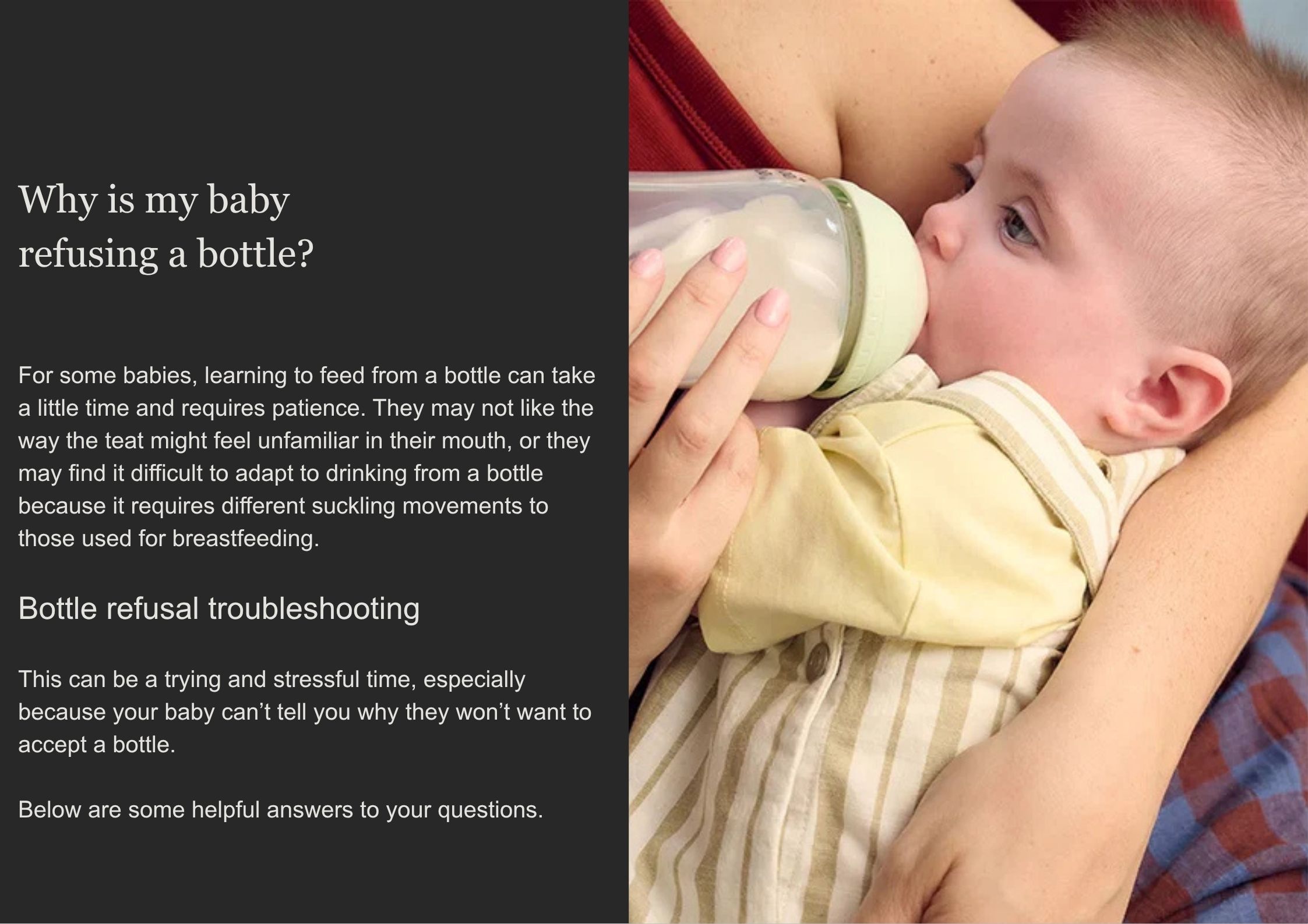 Here are some comprehensive troubleshooting questions and handy bottle acceptance tips and tricks that may help your baby to take a bottle.