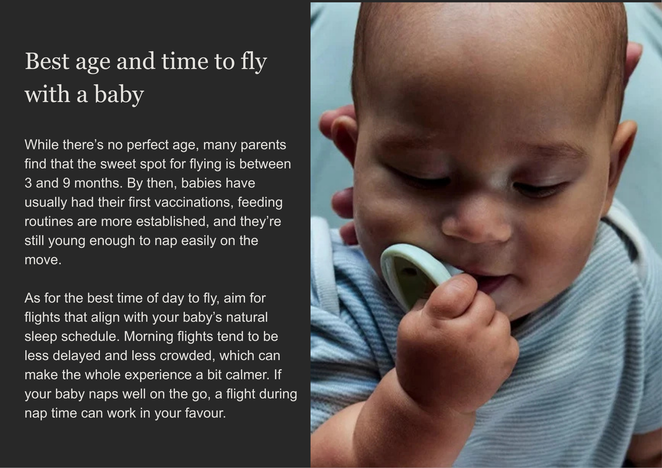 Every baby is different, though. If your baby was born prematurely, has any health concerns, or you’re planning a long-haul trip, it’s best to speak to your GP or health visitor before booking anything. They’ll help you decide what’s safe based on your baby’s individual needs, not just the airline’s policy.