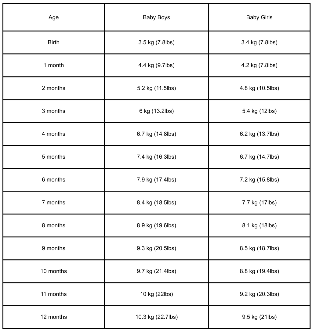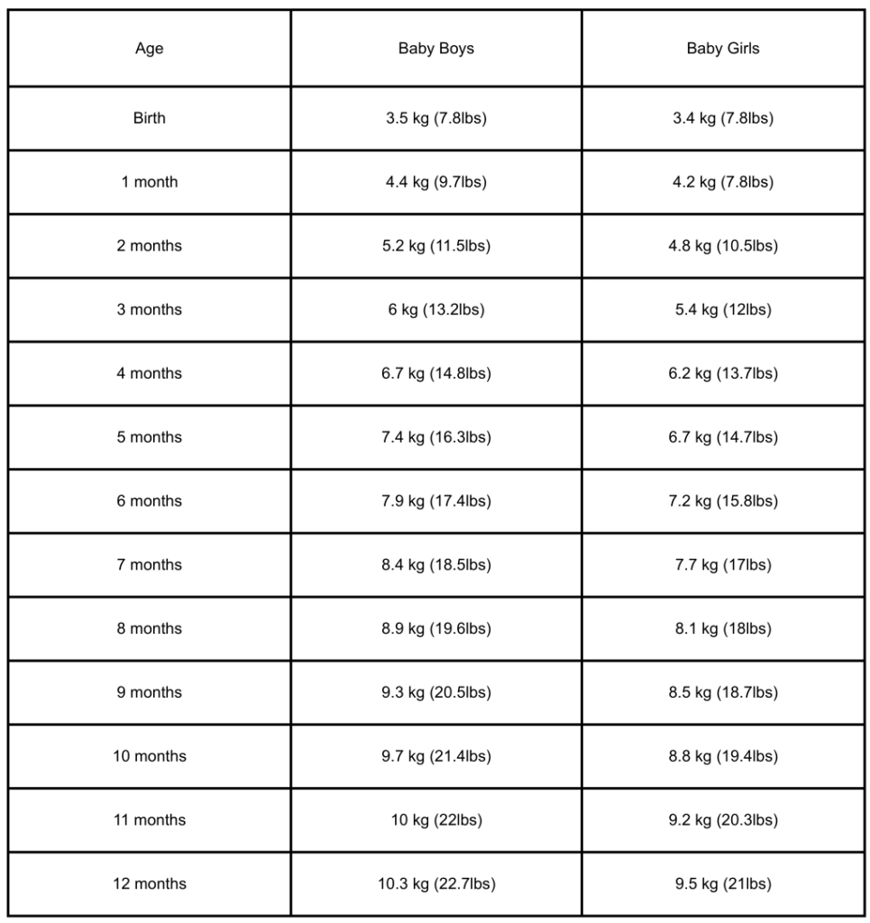This chart is from the WHO (World Health Organisation) and is just a rough guide to the average 50th centile baby weights in their first year. Babies who are born prematurely before 37 weeks are monitored using a slightly different weight chart.