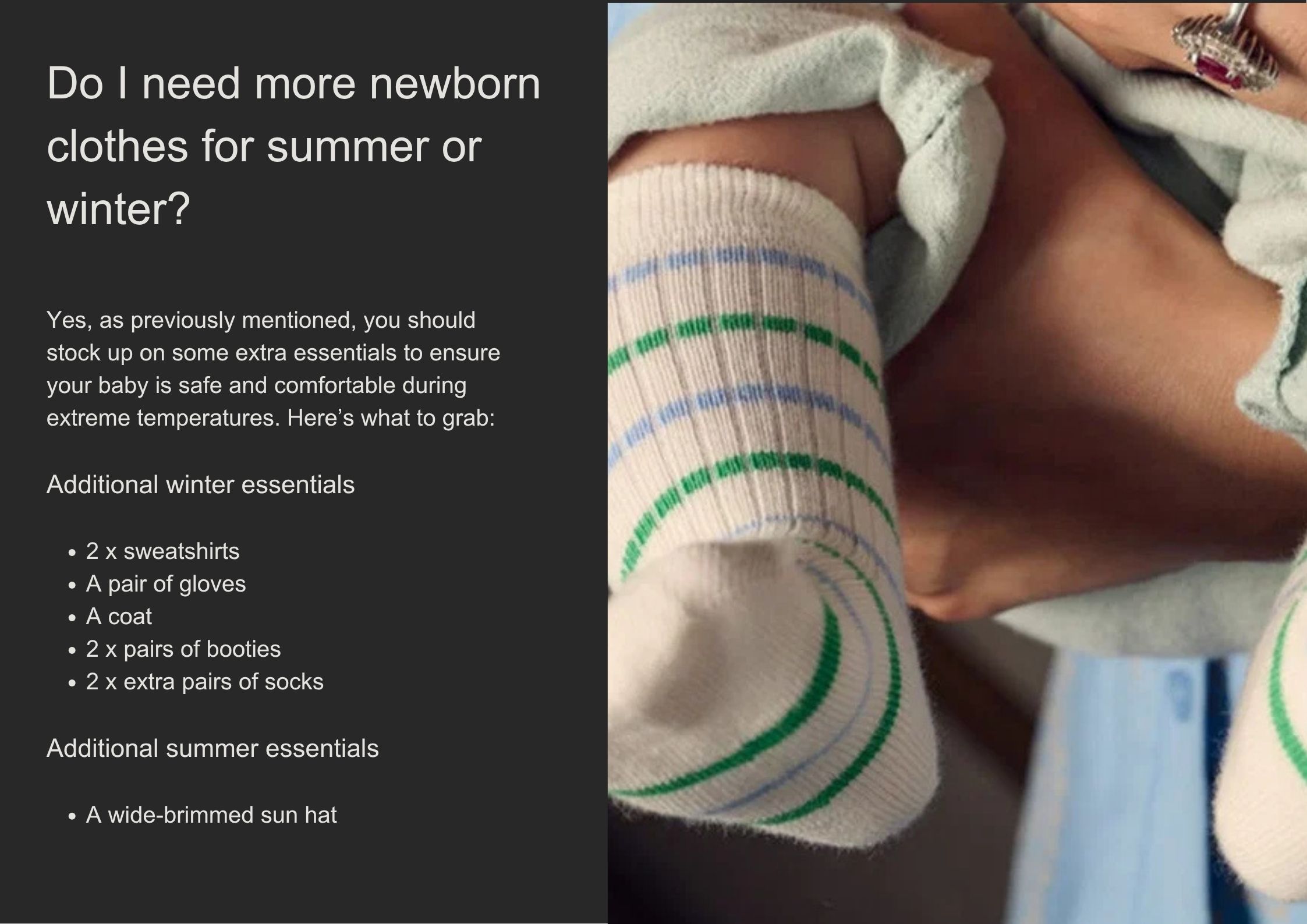 - When shopping for your newborn baby, consider the season and temperature. If during summer, make sure to purchase a wide-brimmed sun hat, and if it’s during winter, include 2 jerseys, a pair of gloves, a coat, 2 pairs of boots, and a couple of extra pairs of socks.