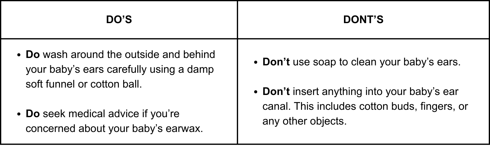 You should never insert anything into a baby’s ear. Doing so could potentially push wax further into their ear canal and cause damage to their delicate skin and eardrum.
