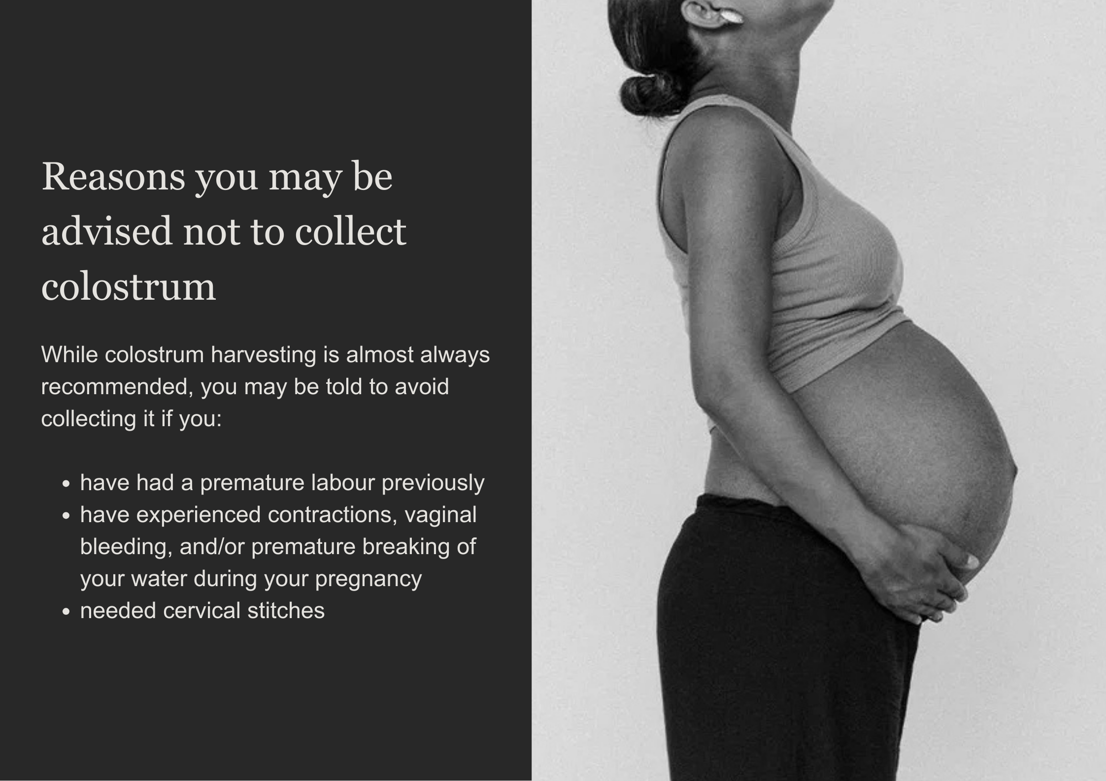 If you experience mild labour contractions or cramps that feel like period pain, it’s recommended that you stop collecting colostrum. Then, take some time to rest before trying again. If contractions continue while you’re collecting colostrum, you should seek medical advice and wait until you’re closer to your due date before starting again.