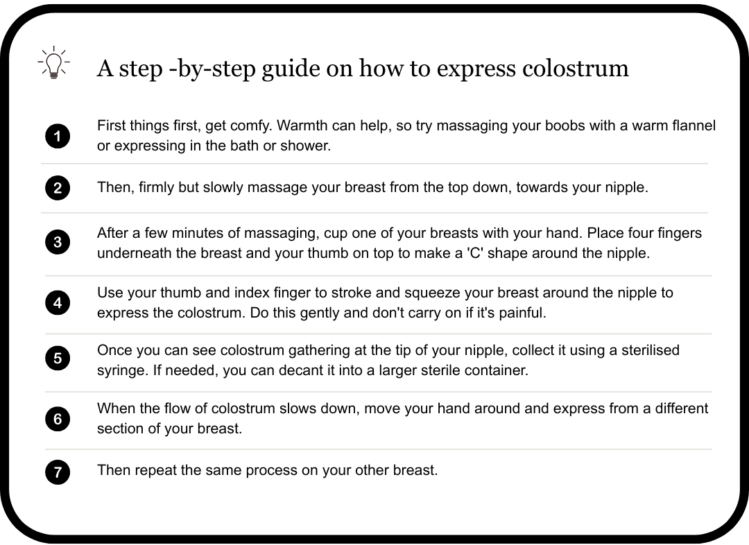 Before you begin to hand express and collect colostrum, be sure to speak to your midwife or a healthcare professional first as they can help make sure it’s right for you and your baby, as well as answer any questions you have.
