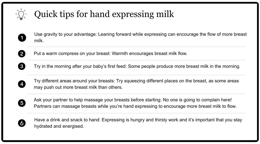 Expressing breast milk by hand involves gently squeezing your breast to get breast milk out and then collecting it in a sterile container, ready to go into storage or to feed to your baby. It can be useful if you don’t have a breast pump or want some quick relief from engorgement.