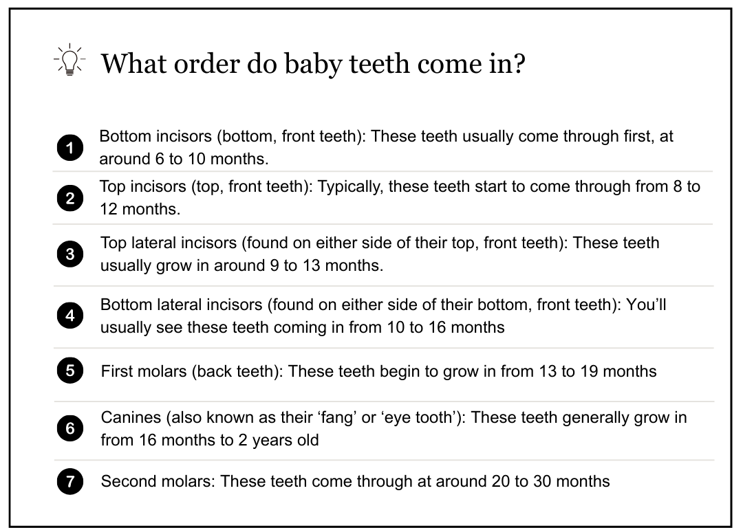 Use the list we’ve created above as a guide. If your baby’s teeth grow in a different order, it’s worth letting your dentist know, as this can indicate a possible problem like congenitally (inherited) missing teeth, or a wider health condition.