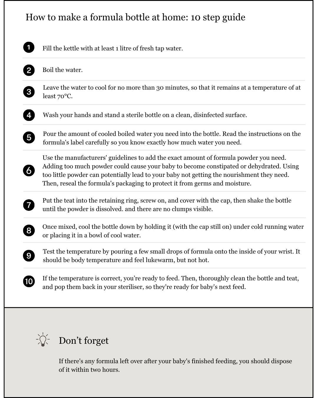 To reduce the risk of infection, every piece of feeding equipment you use should be thoroughly cleaned and sterilised before every feed. This should be done until your baby is 12 months old. You should also always follow the instructions on the formula’s packaging carefully when you make up a bottle feed.