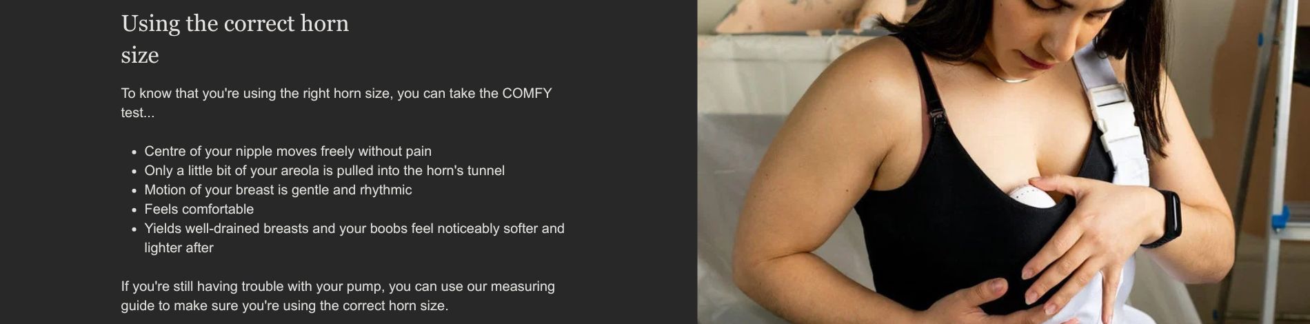 • When expressing using a wearable breast pump, make sure you choose the right horn size so your nipple fits comfortably and milk can flow with ease.