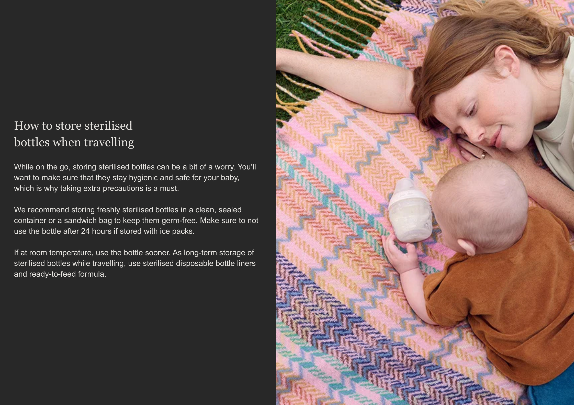 • To sterilise bottles when travelling, you’ll either need a microwave steriliser, a self-sterilising baby bottle if you’re only doing the one feed, or sterilising tablets. If taking pre-sterilised feeding equipment with you, make sure to store it in a sealed container or a zip-locked sandwich bag surrounded by ice blocks for it to stay sterile for 24 hours.