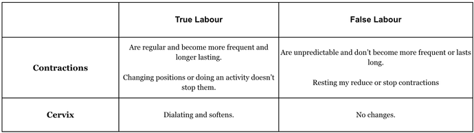True labour is when the contractions are regular, increasing in intensity and frequency, and do not go away with rest or change in position. False labour, on the other hand, is when the contractions are irregular, not increasing in intensity or frequency, and may go away with rest or a change of position.