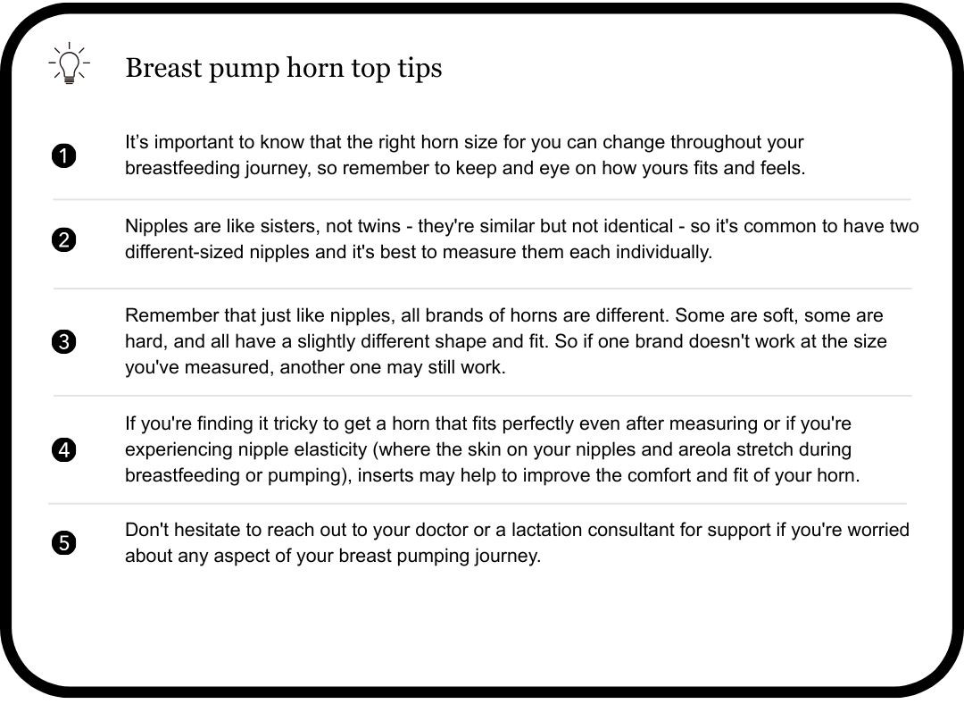 Measuring your nipples and making sure that you’re using the right horn size means that every pumping session is as comfortable, efficient, and effective as possible.