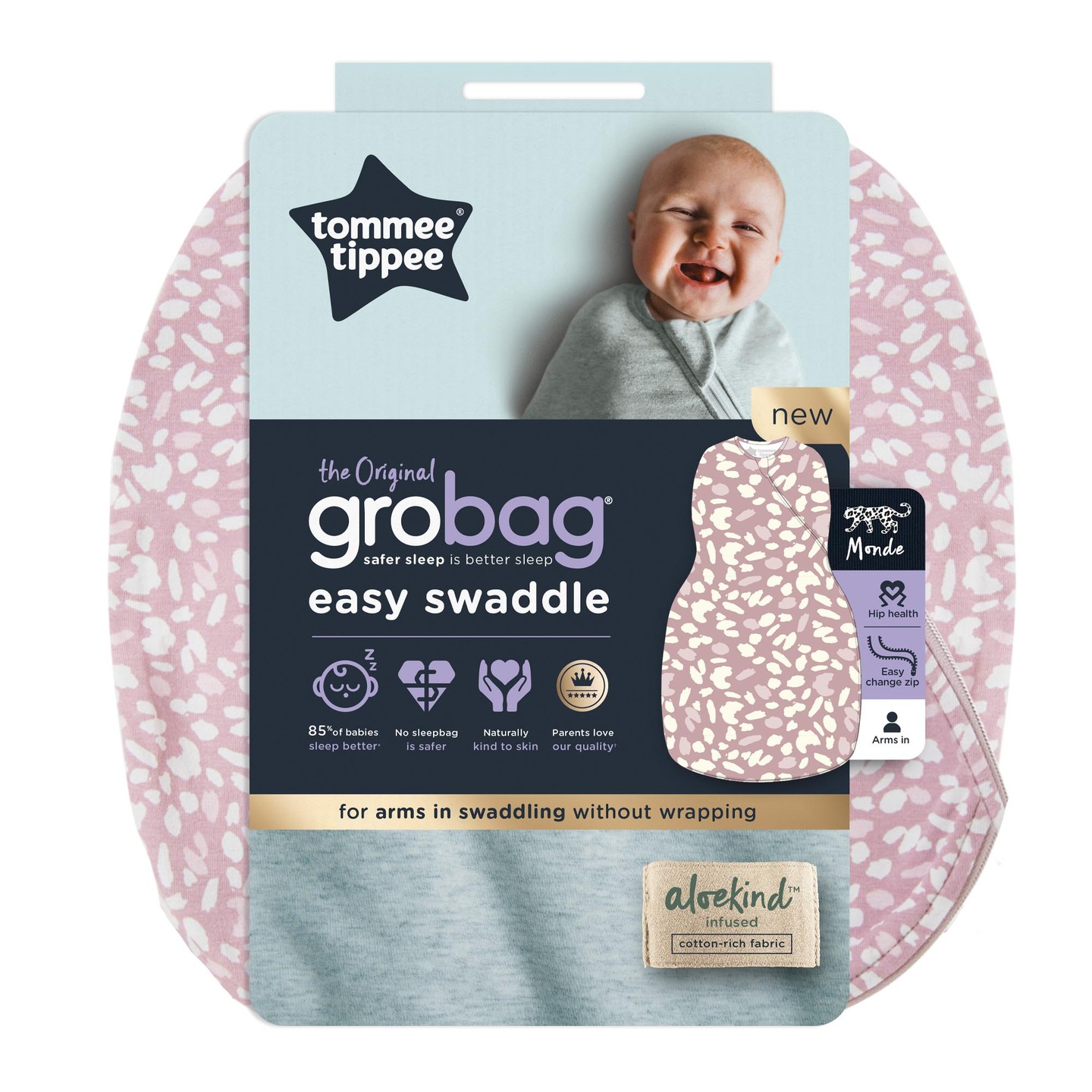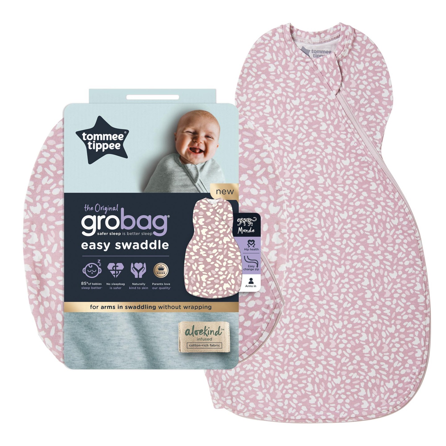 Our Easy Swaddle is made with our signature ALOEKIND™ fabric, a unique cotton-blend infused with naturally soothing Aloe Vera, making it kind to baby’s skin and perfect for a comfortable night’s sleep.