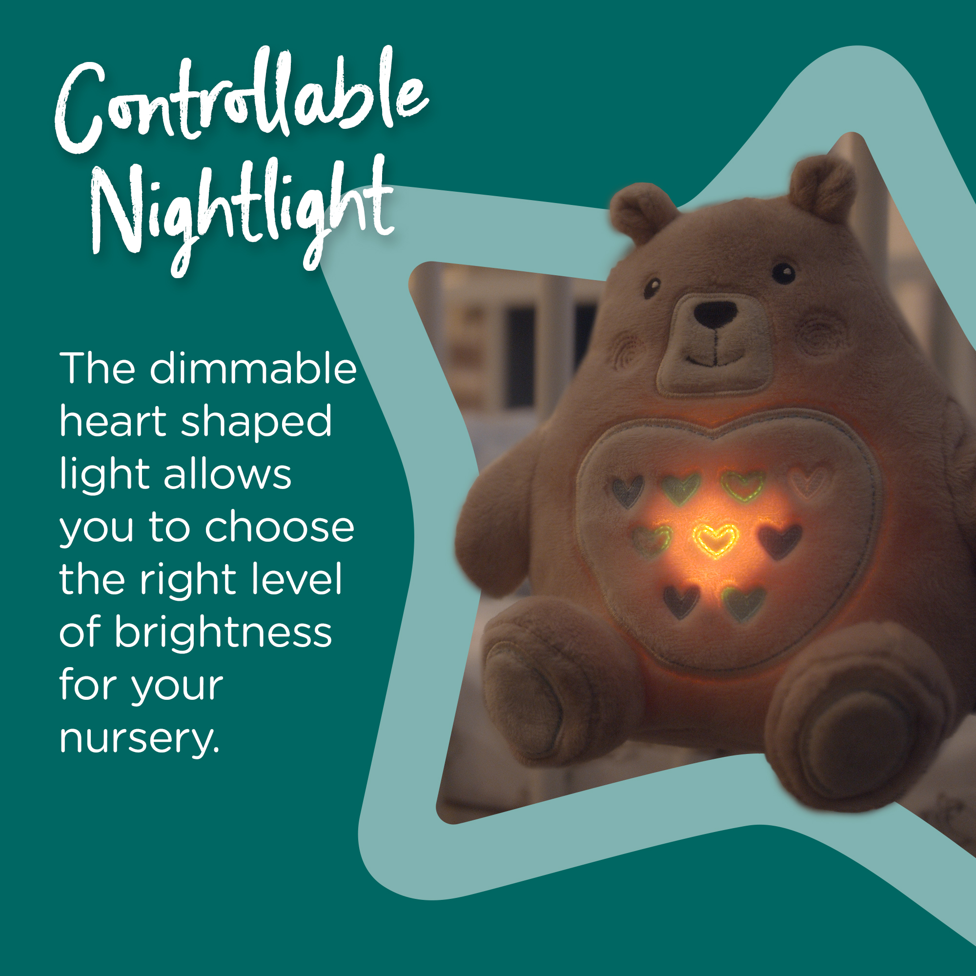 The dimmable heart-shaped light in your Grofriend’s tummy helps to create a calming sleep environment and doubles up as a reassuring nightlight.