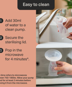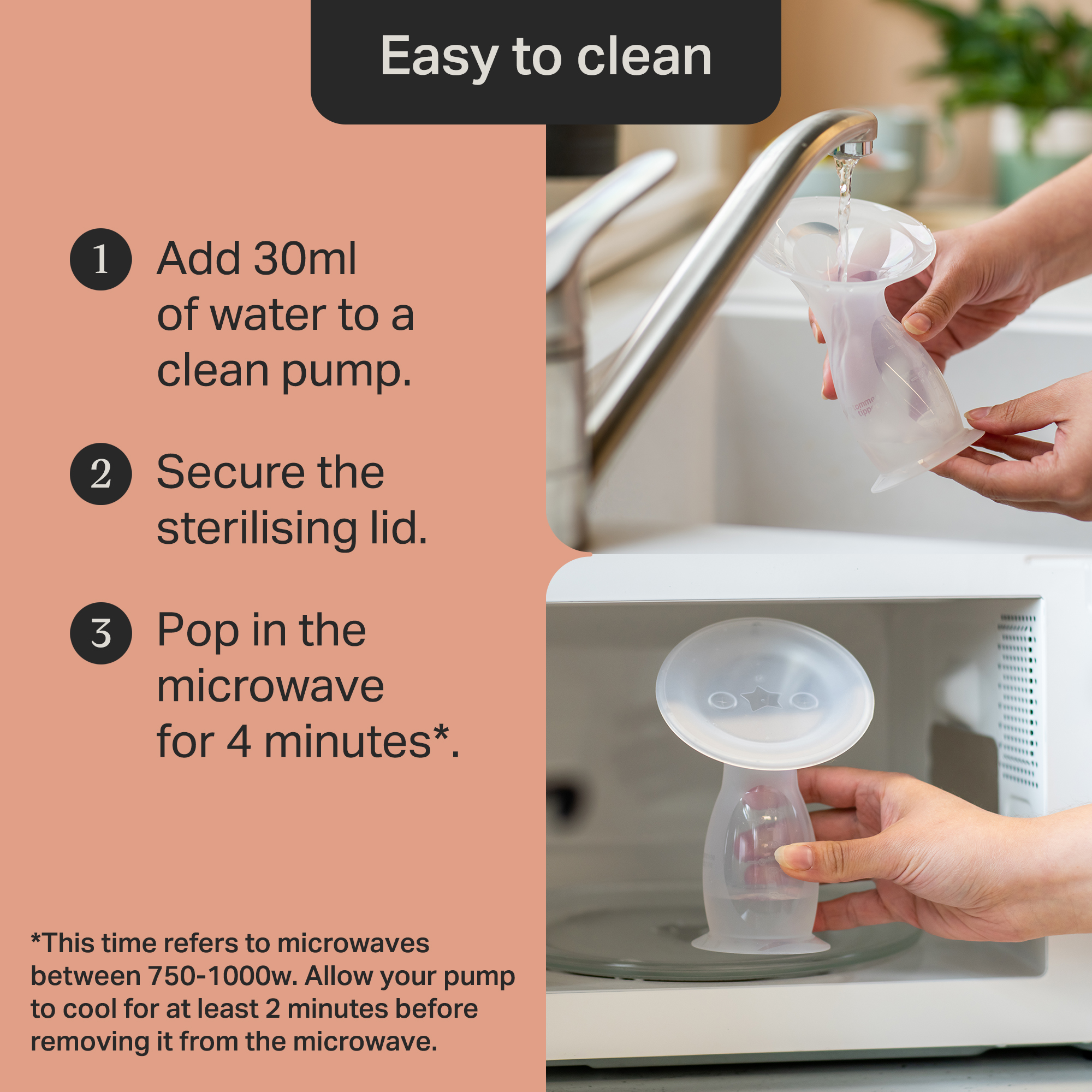 • Sterilising lid: Complete with a sterilising lid, you can sterilise your pump in the microwave. Simply add 30mls of water to a clean pump, secure the lid and pop in the microwave for 4 minutes*