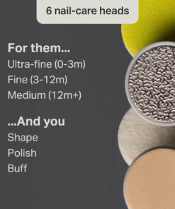 • For baby and for you: Includes 3 age-coordinating filing heads for the different stages of baby and toddler nail growth plus 3 filing heads designed to shape, buff and polish adult nails.