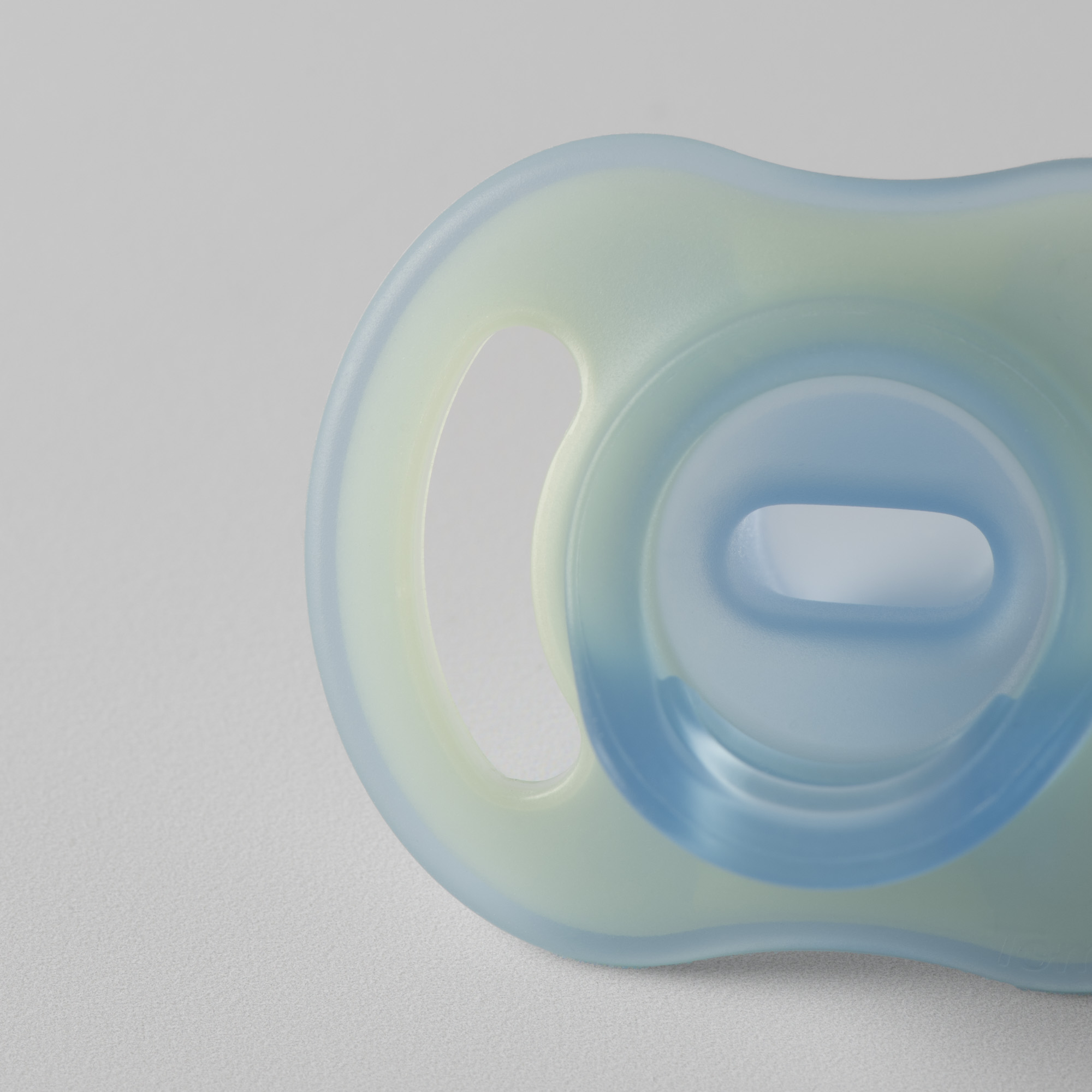 The lightest one-piece silicone soother, designed to glow in the dark for less bedtime stress. With a familiar, soft, skin-like feel and improved airflow for extra comfort, this nighttime dummy is made to stay securely in baby’s mouth and help them stay soothed for longer, day or night.