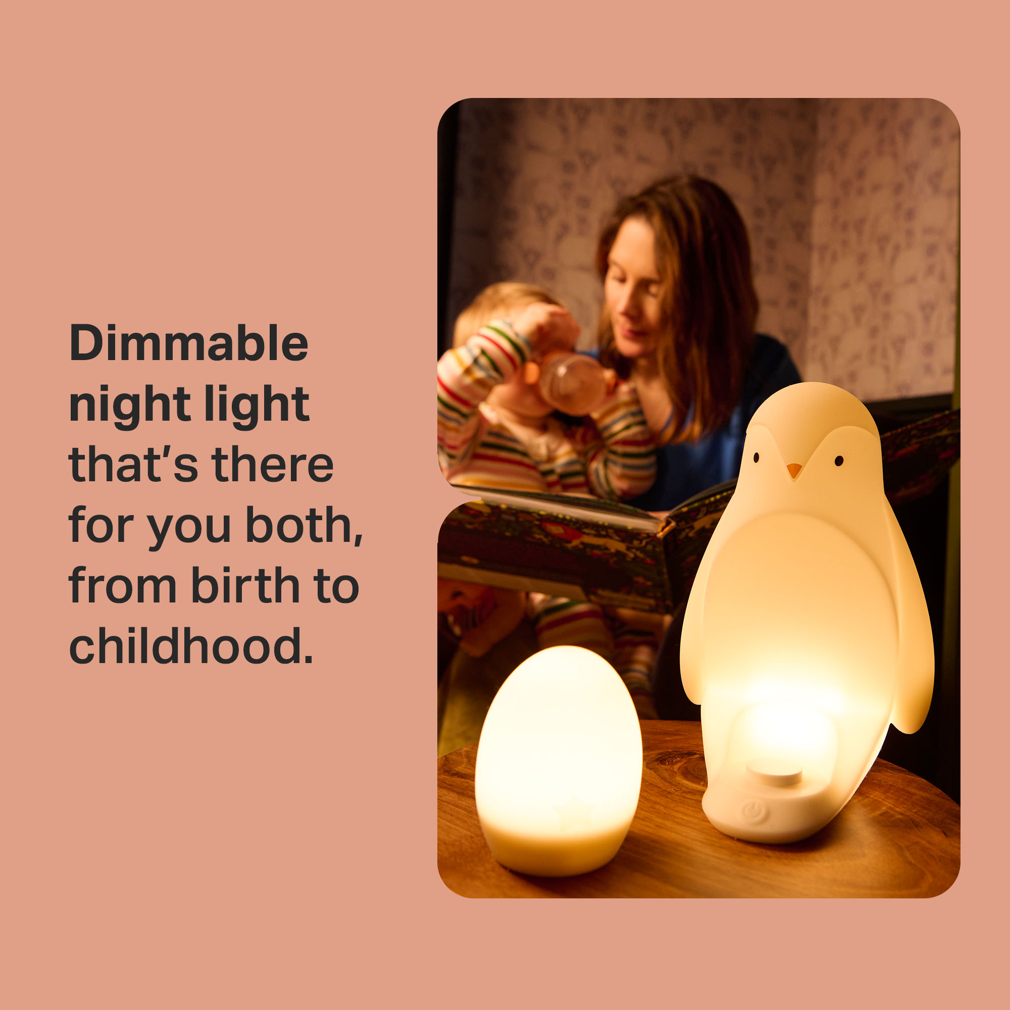A nighttime friend that’s there for you both. From late-night feeds and nappy changes to bedtime stories and independent trips to the toilet, this baby night light is designed to comfort and reassure at every stage. The portable egg functions as a nursery night light, lasting up to 10 hours before recharging on the penguin base during the day.