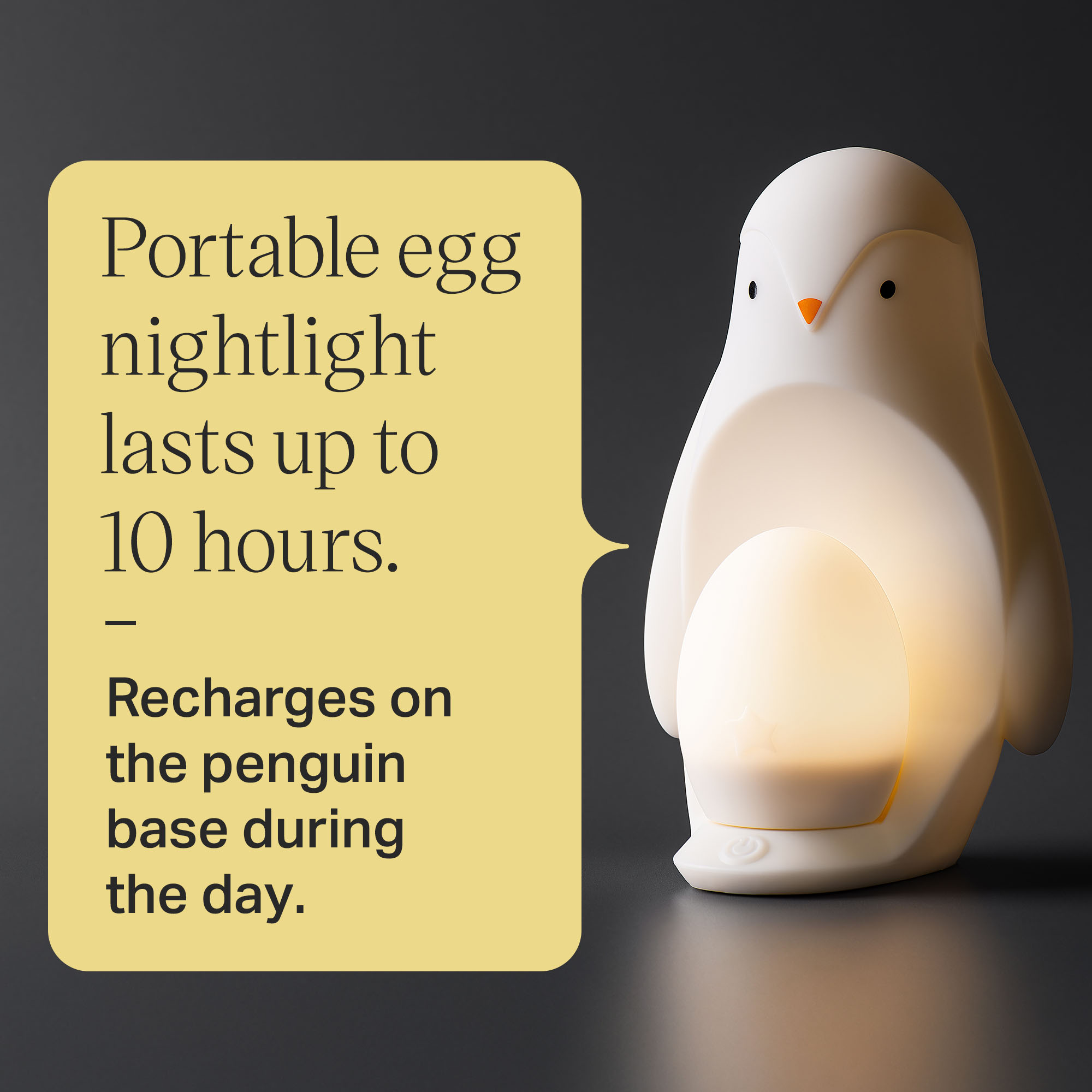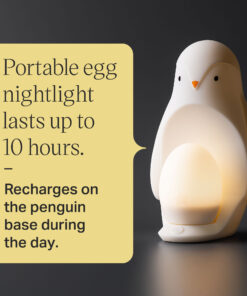 - Detachable egg light: Super soft, lightweight and perfectly sized for little hands, the portable egg light lasts up to 10 hours and recharges on the penguin base during the day.