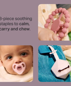 A 3-piece gift set of stylish soothing essentials designed to calm, carry, and chew. Settle your baby with our original ultra-light soother, crafted as a one-piece* design featuring a symmetrical silicone teat suitable for babies aged 0–6 months. The coordinating silicone carry case keeps up to two soothers clean and within easy reach, perfect for use on the go.