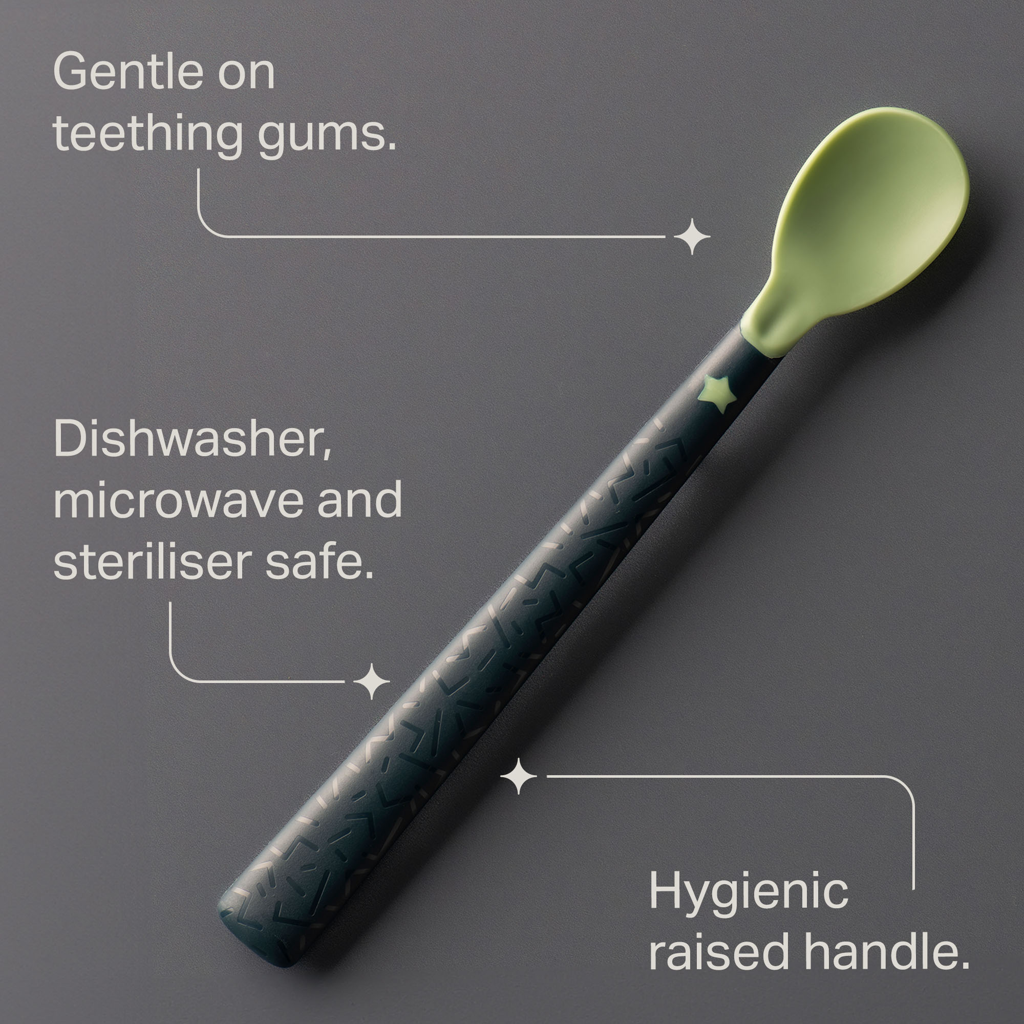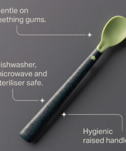 The super soft tip of the spoon gently tips the food into the baby’s mouth. When first learning to self-feed, babies can only strip food from a spoon, so if the spoon is too hard not all of it goes into baby’s mouth. That is why we’ve designed all our weaning spoons to make sure they are soft enough so that when baby’s tongue touches the spoon it pushes the food up gently into the mouth.