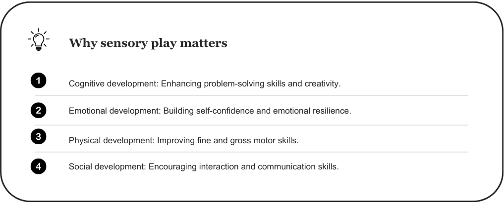 Sensory play (any activity that engages sight, sound, touch, taste, smell, or movement) helps build nerve connections in the brain, supports language development, and lays the groundwork for skills like problem-solving, balance, and coordination.