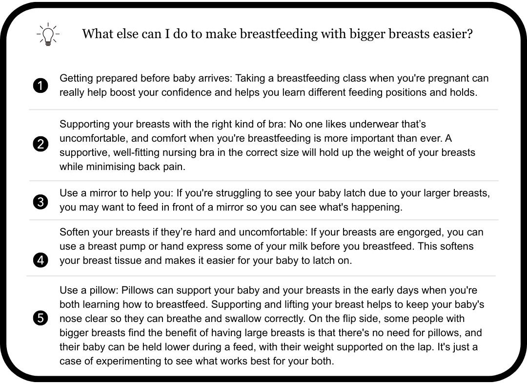 People with large breasts can sometimes encounter issues when breastfeeding, these can include: