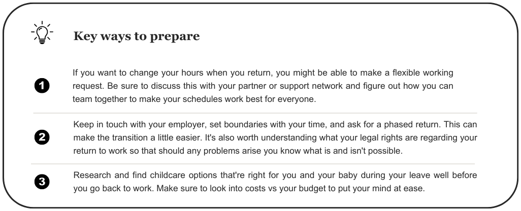 - It can be tough but try to spend a little time apart from your baby before you return to work. Even to focus on some well-earned you time! It can help them too as that way, they’re less likely to feel anxious when you’re away.