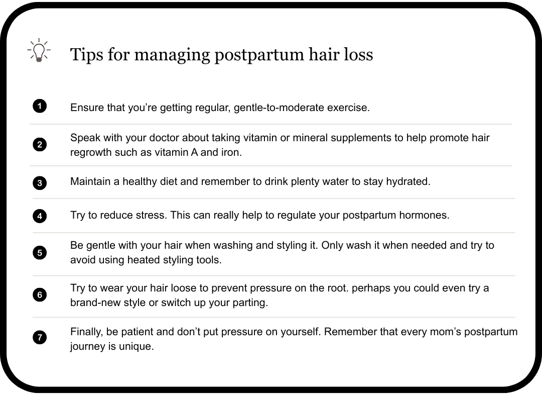 Remember that postpartum hair loss is common amongst new mums, but if you are worried that your hair loss is severe or notice certain sections of your scalp where the hair is much thinner, you should consult your doctor. They will be able to check for any other conditions that can cause hair loss and recommend treatment.