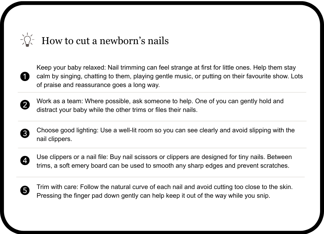 • Trim nails when your baby is calm, sleepy or sleeping, or after bath time for easier cutting. This makes their nails softer and reduces fussing, so you can trim more safely and with less stress.
