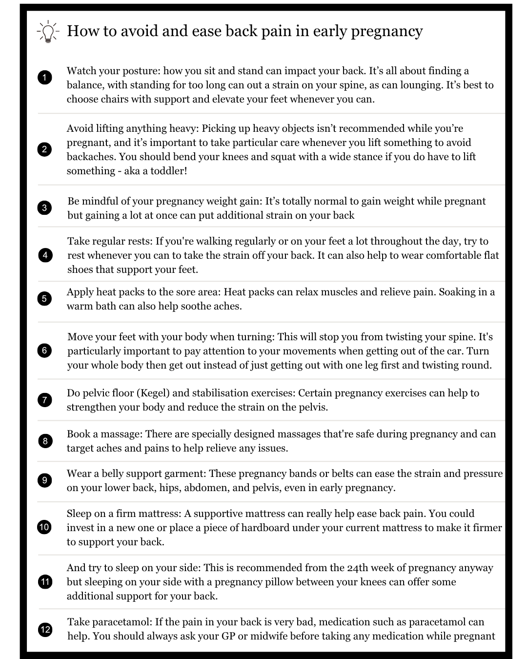 Back pain is a common first trimester symptom and there are a few reasons why it happens. Let’s run through the causes of pregnancy back pain one by one.