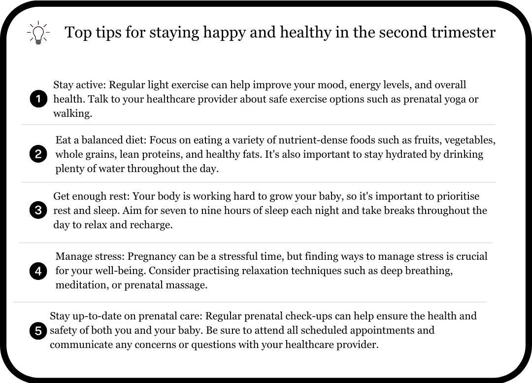 - Increasing energy levels: Many people find that they have more energy during the second trimester as their bodies adjust to the changes of pregnancy.