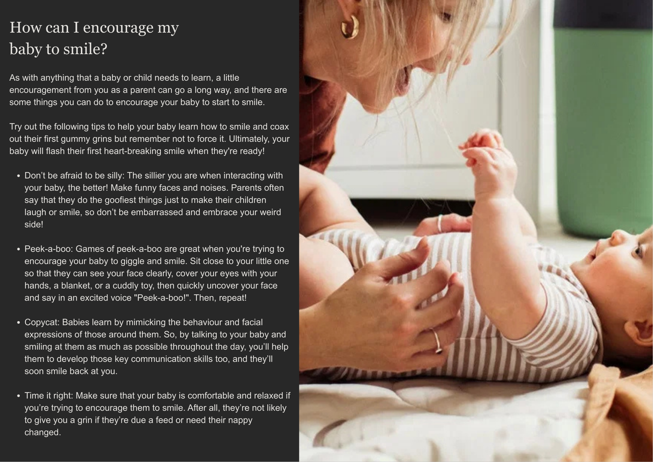 As with all aspects of a baby’s development, there’s no exact timeline that a baby should follow when learning to smile. All little ones are different, but here’s a rough guide to when they usually start to smile.