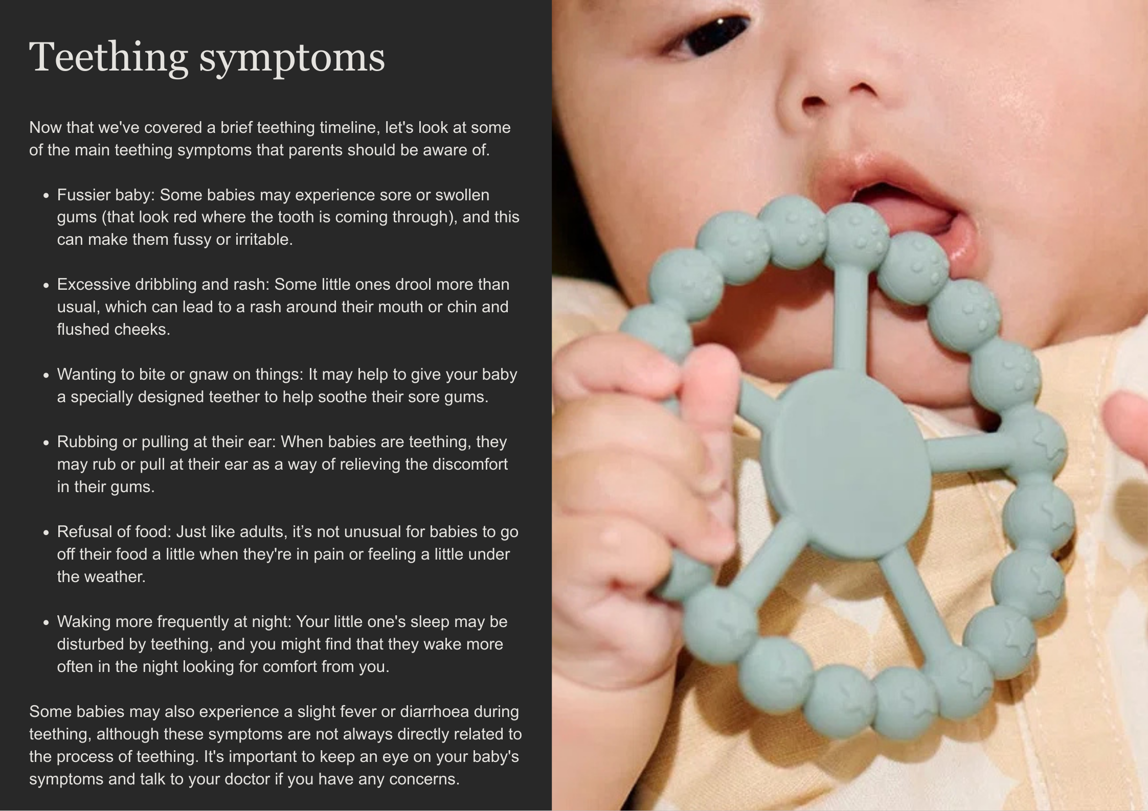 For some, teething symptoms arrive and their first teeth come in as early as three months, while others don’t start teething until after their first birthday.