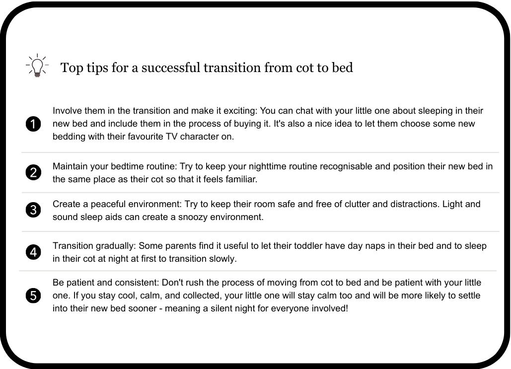 Some little ones will love the idea of moving to a brand-new bed, while others will take a little more time to get used to the idea. To help you out, here are our top tips to help make your little one’s move from a cot to a bed as successful as possible.