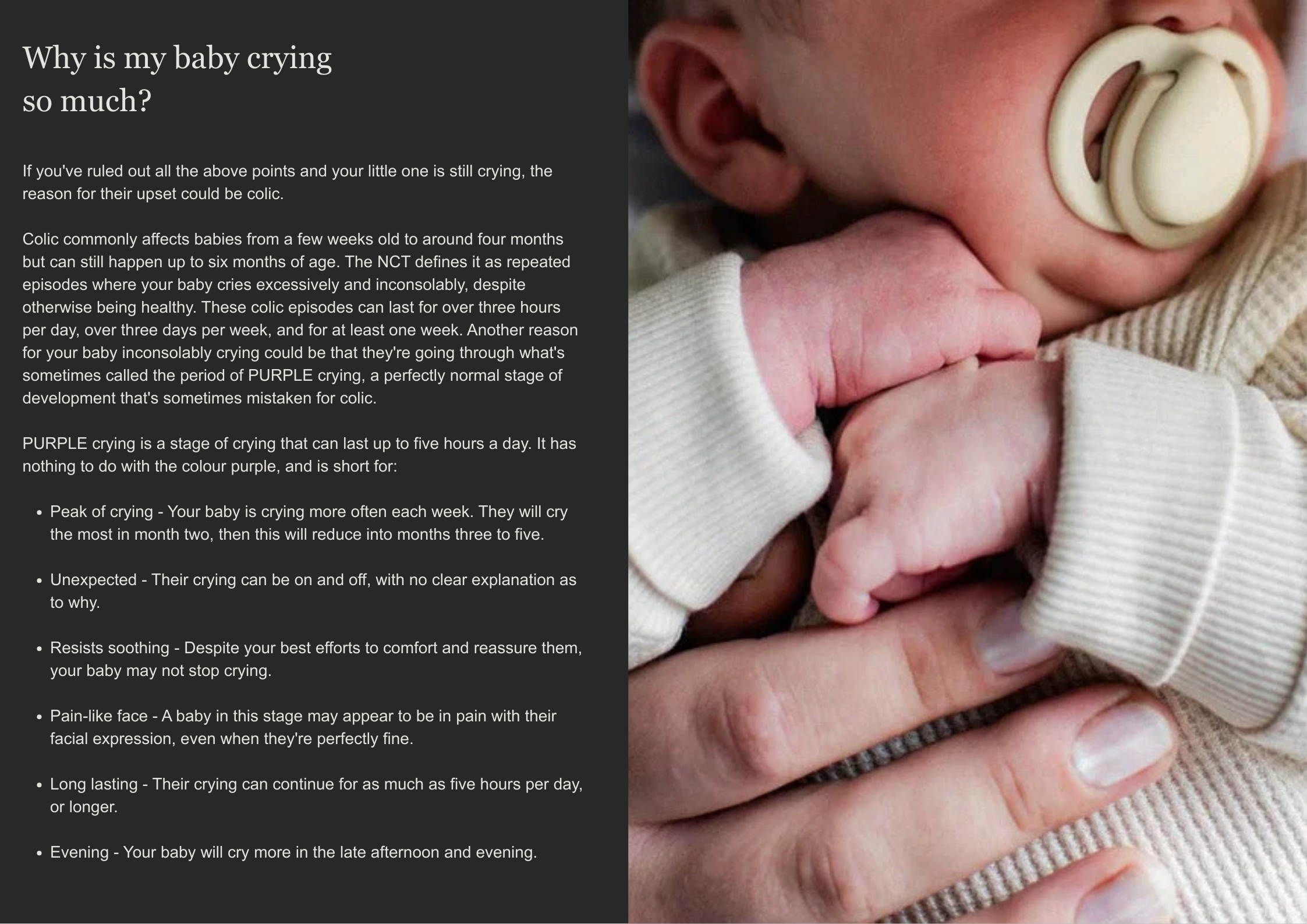 Does your baby need their nappy changed, are they overstimulated or being irritated by a loud noise, or are they too hot or cold?